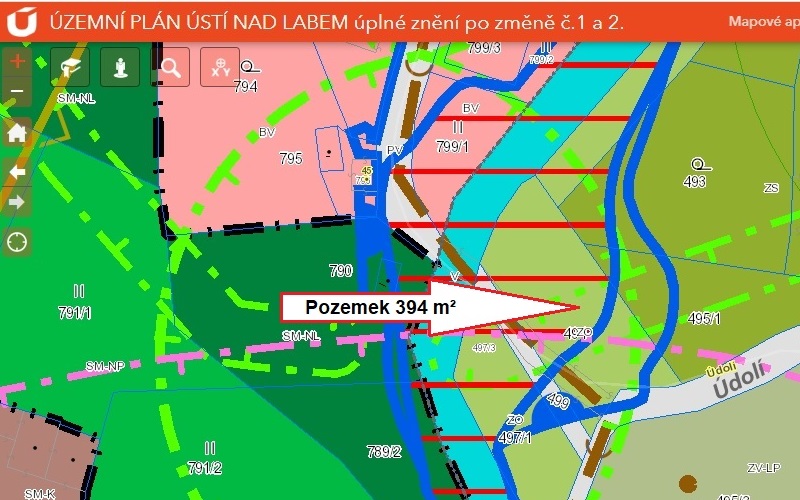 Prodej pozemku o velikosti 394 m² na břehu Klíšského potoka, v klidné, dobře dostupné lokalitě těsně navazující na zástavbu, Ústí nad Labem.